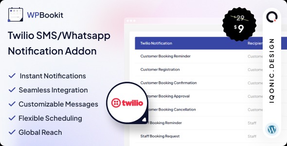 The “WPBookit – Twilio SMS/WhatsApp Notification (Addon)” enhances the WPBookit plugin by enabling SMS and WhatsApp notifications via Twilio, ensuring timely and effective communication with clients. Below is a comprehensive list of its features: